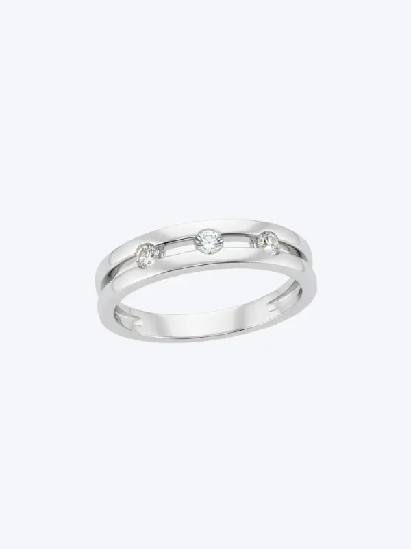 A sophisticated and contemporary symbol of elegance, this 18KT white gold ring features a unique open-channel design. Three brilliant natural diamonds, totaling 0.13 carats, are expertly tension-set between two parallel bands, creating a striking floating effect. Meticulously polished to a mirror-like finish, its 4.1-gram weight provides a substantial and premium feel. This piece represents the perfect harmony of modern engineering and timeless luxury, embodying the signature craftsmanship of Neophytou Precious Jewellery.