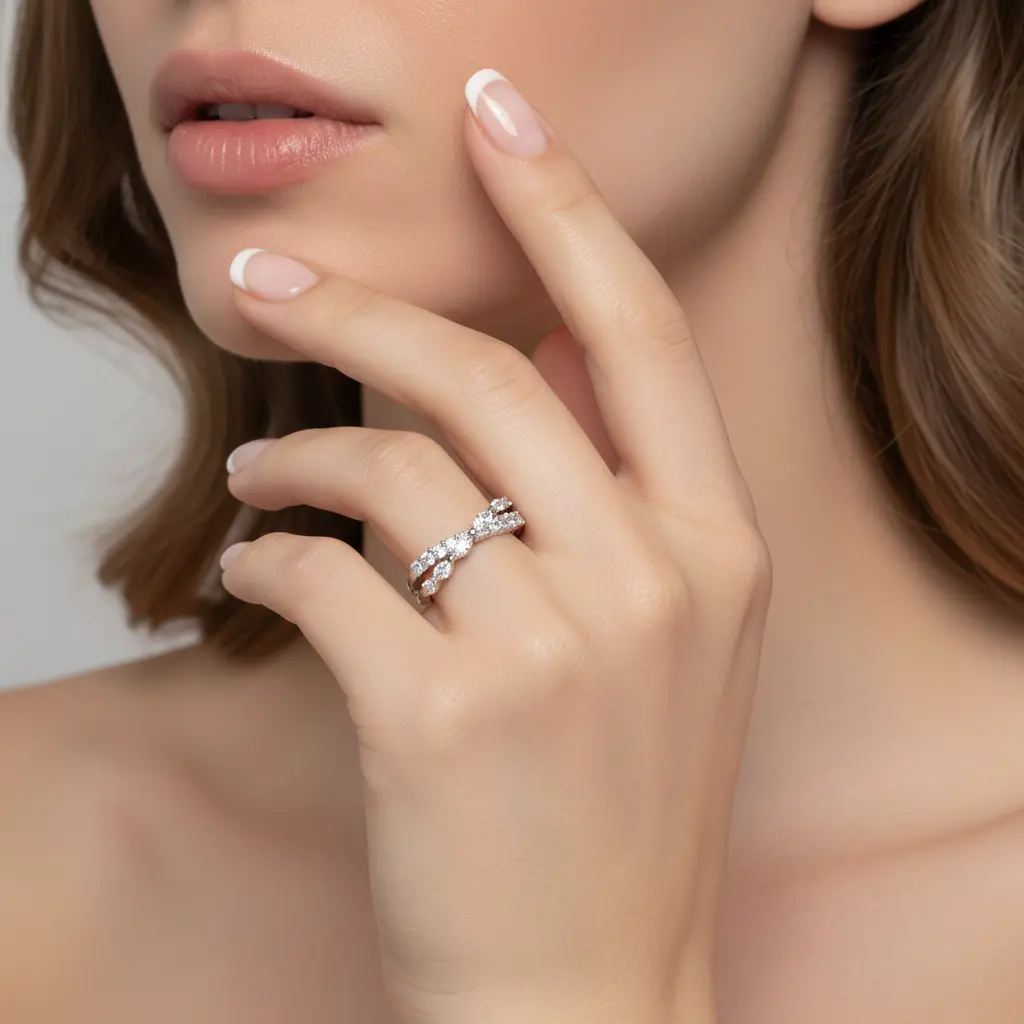 Experience the grace of subtle movement with our handcrafted Crossover Diamond Band. This artistic design features a harmonious blend of brilliant round diamonds and sharp marquise-cut stones, flowing seamlessly across the finger to create an illusion of intertwined luxury.