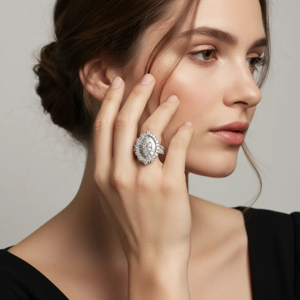 This stunning diamond ring features a captivating 1.00-carat natural diamond at its center, surrounded by 36 baguette diamonds totaling 1.05 carats, and additional side diamonds totaling 0.49 carats. Each diamond is of the highest quality, with VS1 clarity and an excellent cut, ensuring exceptional brilliance and fire. The ring is set in a refined white gold band, offering a timeless and elegant design that highlights the beauty of the diamonds.