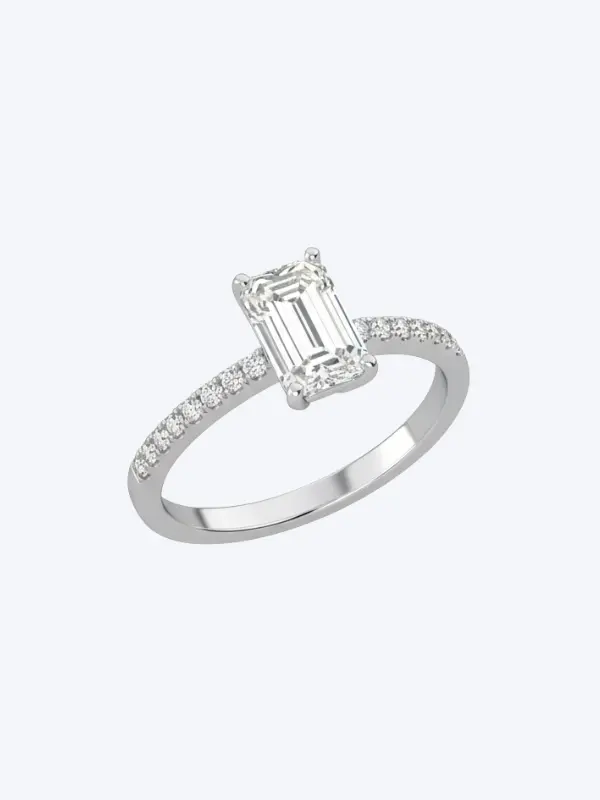 This sophisticated 18KT white gold ring features a striking 1.50-carat emerald-cut lab-grown diamond, beautifully accented by 0.25 carats of side stones. Certified by IGI Report No. 629420006, the clean lines of the emerald cut are perfectly complemented by the cool, polished finish of the 18KT white gold setting. A timeless and architectural piece, it is an ideal choice for those seeking a modern yet classic engagement ring.