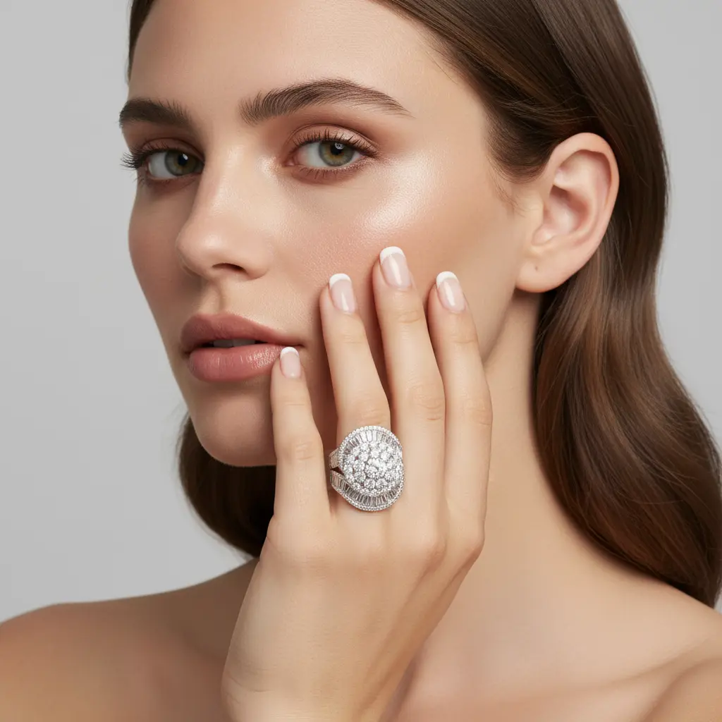 Command attention with our magnificent, handcrafted Round and Baguette Diamond Ring. This architectural masterpiece features a breathtaking sunburst arrangement, combining high-brilliance round diamonds with sleek, structured baguette-cut stones to create a dome of unparalleled light and dimension.